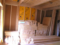 内装床(なら材・カエデ材)張りが完了し、内装壁、天井(国産ひのき材・パイン材)張り工事中です。
