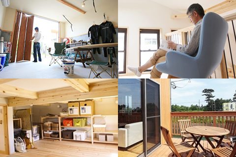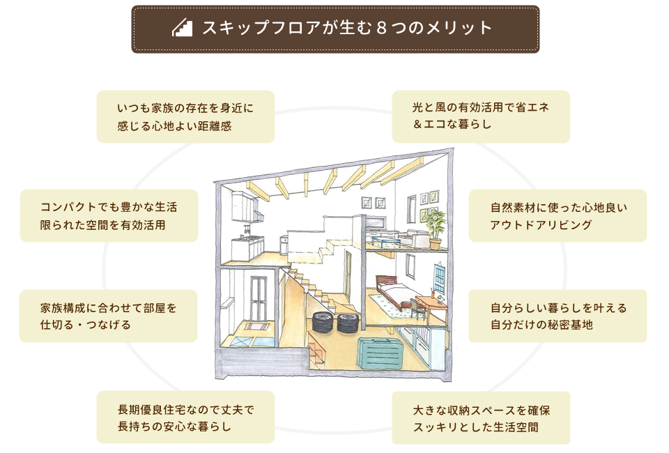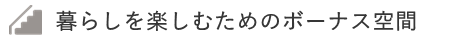 スキップフロア構造によって、これまでデッドスペースだった場所を有効活用することが可能となりボーナス空間が生まれます。生活に必要なスペースに加え、趣味のための部屋、収納スペース、ウッドデッキなど自由に使えるスペースが手に入り「住む人が描くライフスタイル」を実現可能にします。 |