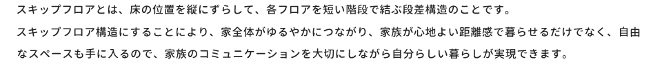 部屋を壁で仕切るのではなく、段差によって空間で仕切るため家全体が一つの空間の中で「縦」「横」「斜め」にゆるやかにつながり、同じ建坪の一般的な2階建て住宅に比べると、より広々と開放的に暮らすことができます。家族みんなが心地よい距離感でどこに居てもお互いの声や気配を感じられる安心感もあります。 |