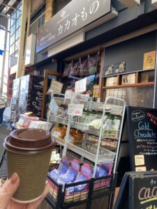昭和レトロな商店街に珍しい、カカオ専門店で購入したショコラショーを飲みながら