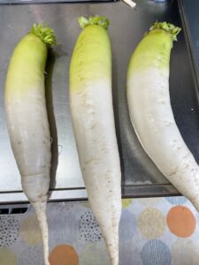 とりあえず3本の大根を畑からひっこ抜き洗って準備完了。