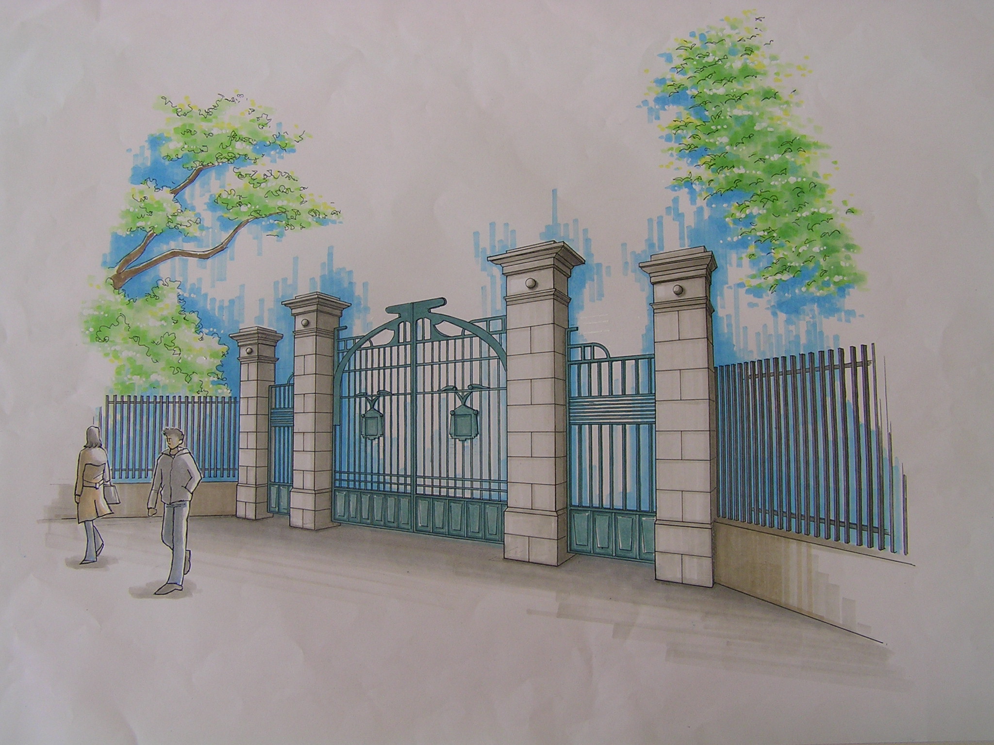 門柱はその保管していた石をそのまま利用、門扉(頂上には鵬(おおとり)をイメージした装飾)は往時の特徴を再現しました。