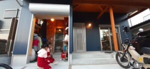 土間収納の壁に棚を付けて、スノーボードやブーツを収納、角はバーを取り付け天井高を生かしてサーフボードを立てる事がてきました。