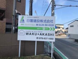 2021年3月8日 / 最終更新日時 : 2021年5月4日 admin 事務所のリノベーション WAKU+の看板設置 無垢の鎧板に文字がにじまないよう白で塗装した上に、WAKU+の看板文字を書いていただきました。 カッティングシートを貼り、文字部分を黒く塗っています。 WAKU+の看板と横にイラストも描いてもらいました。 さらに、北側から江井島駅に向かって下りてくる際、入る場所がわかりにくいため、畑の持ち主の方にご了解いただき、野立て看板を設置。 日置建設と合わせてWAKU+AKASHIの看板が完成し、夜間照明も付けられるように只今申請中です。