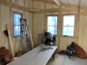 サッシの取付けと外壁面材が貼り終わり、外壁面の電気配線が完了し、天井、壁の発泡断熱工事が完了しました。