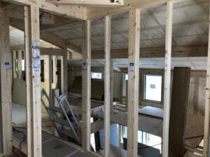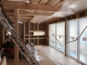 サッシの取付けと外壁面材が貼り終わり、外壁面の電気配線が完了し、天井、壁の発泡断熱工事が完了しました。