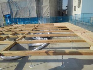 土台を取付け、床合板も含めホウ酸での防蟻処理を行い、第一種換気の床下ダクト配管を終え、床合板を貼ります。