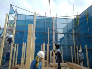 上棟当日は朝から大工さんが手際よく柱を建て、梁材等をレッカーで順次組み上げていきます。