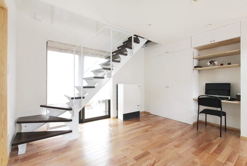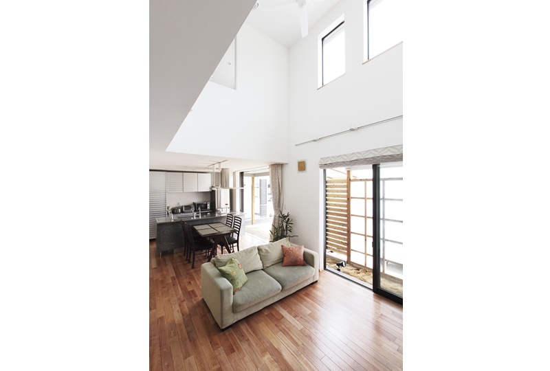 無垢のサクラ材の床、天然の塗り壁のチャフウォールを採用。部屋全体に光が行き届き、空気もさわやかです。