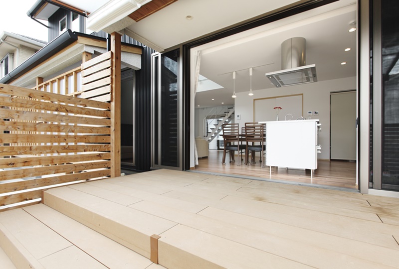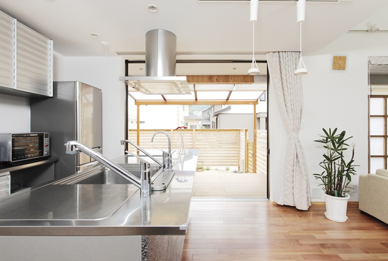 キッチンからデッキへのつながり部分は、外の空間も豊かに取り入れてほしい、とあえて「ラグジュアリーテラス」と名付けました。TOYOキッチンのステンレスの素材感がスタイリッシュな空間。3Dシンクは、センターキッチンの使いやすさを追求しています。