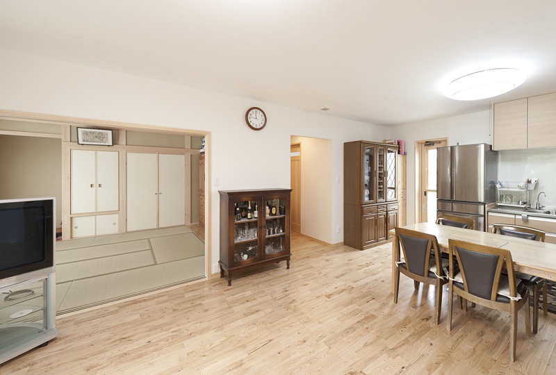 1階の親世帯は床に節のあるクリ材をはり、温かみのある雰囲気に。和室との間仕切り建具はすべて引き込めるようにし、親戚が子ども連れで集まってものびのび過ごせる空間になっています。もとの家の暮らしやすさは継承しつつ、性能が高まりました。1階リビング前と和室前にウッドデッキを設け、暖かな日には日向ぼっこもできます。