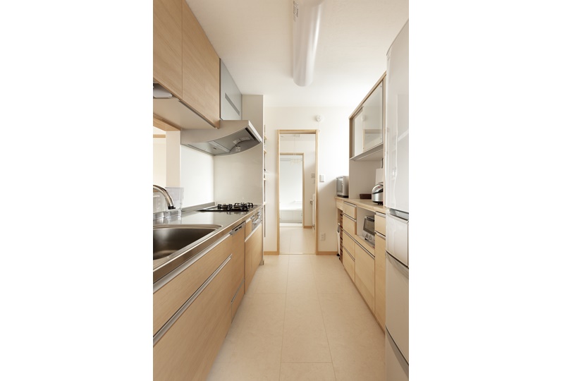 忙しい奥さまの暮らしに配慮し、室内の物干し場やバルコニーへの動線もこだわりました。『料理と洗濯の下洗いを同時に進行できて便利です』と奥様談。