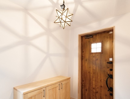 木で造作した靴箱のあるシンプルな玄関は、個性的なランプから広がる光がアクセントになっています。