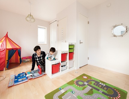 吹き抜けに面して子ども部屋には丸窓、寝室は白い窓を設置。家族のつながりを大切にしています。