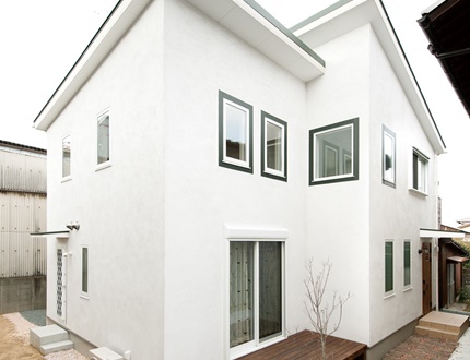 モダンな雰囲気に仕上がったシンプルな外観は、窓回りのオリーブグリーンの枠がアクセントになっています。