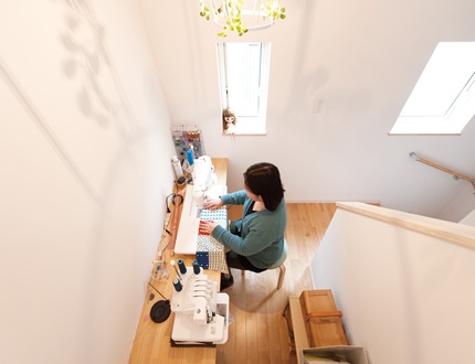 奥様のスペースは、スキップフロアを利用して中2階にあります。家族の気配を感じながら針仕事にも集中できます。