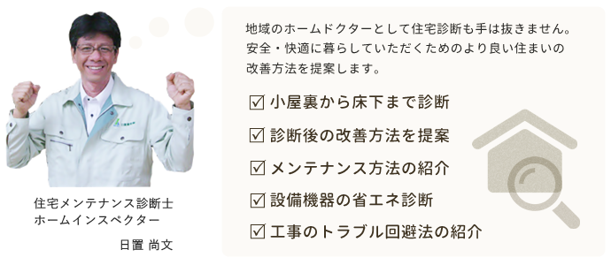 柱・梁・屋根・バルコニー・外壁・キッチン・バス・トイレなどの普段目にしている箇所から、小屋裏・床下のような目に見えない箇所まで、建物の状態をしっかり診断し、その診断結果に基づいて無理・無茶・無駄のない増改築のご提案をさせていただいております。