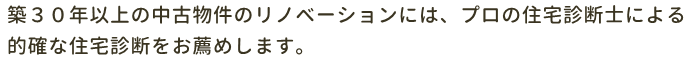 | 住宅診断をすることによって、家の性能のどの部分をどのように改善すればいいのかが、明確にわかります。その診断材料をもとに、より質の高いリノベーションの実現か可能になります。 |