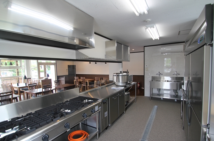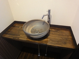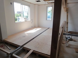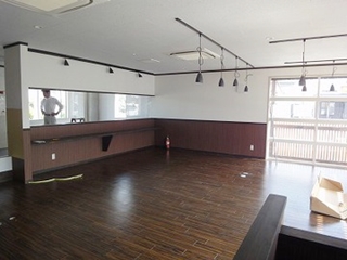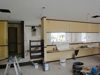 厨房の床のコンクリートがはつれないため、大工さんが厨房部の床下地作業をして勾配をとり、排水溝が取れるように床を上げています。 厨房の床には、防水性のある長尺シートを貼りました。客室スペースのカウンターも取り付け。 |