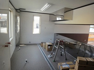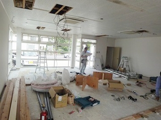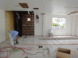 | 客室スペースの電気配線作業、既設トイレを撤去して、大工さんが厨房部の床下地作業を行いました。 |