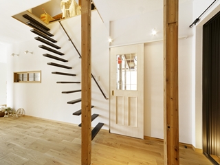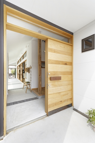 | 家具職人の造作によって、様々な無垢材の表情が活かされた引き戸。 玄関ホールの奥に中庭が見えるように、横長のレトロなガラスをはめ込みました。 玄関から続く土間スペースは、懐かしさと新鮮さが伴うような雰囲気に仕上げました。 |