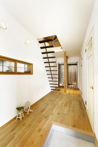 | 小屋裏への階段は踏板だけの軽やかなスタイル。リビングに続く和室もモダンな雰囲気にして、右手の壁には風を通す木枠の窓を取り付けました。 |