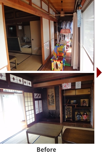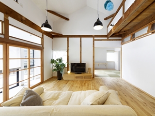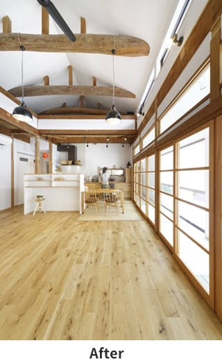 | もとは2間続きの和室や欄間、縁側など昔ながらの和の設え。 耐震補強をして広々とした空間を作り、天井板も撤去して丸太の梁を見せました。 床は幅広のオーク材、壁は天然のチャフウォール、天井は和紙を使用。キッチンのカウンターや壁面収納はオリジナルで造作しました。 |