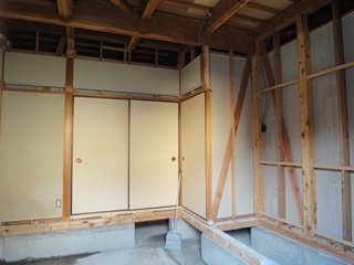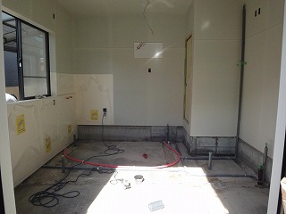 | 和室と押入れの床、天井を撤去。大工工事で水に強いケイカル板を貼り、天井を高くして給排水工事。 |
