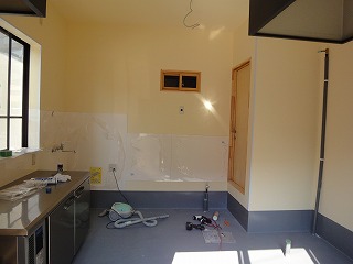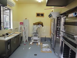 土間コンを打ち、壁・天井を貼り、塗装をして工場となる部分を施工。 壁の塗装をして、塗り床して、パン工房らしくなってきました。 |