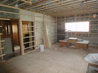 躯体が鉄筋コンクリート造のため、木で下地組み作業。和室との仕切り壁を撤去して対面キッチンのLDKとしました。 仕切り壁がなくなると使いやすいLDKに変わりました。正面壁はタイル張りの予定でしたが、コスト削減のため、クロスになりました。 |