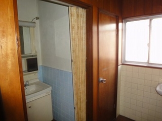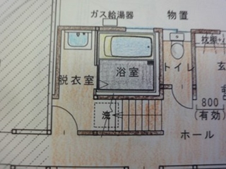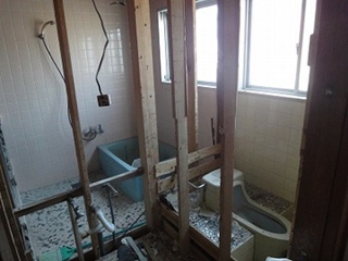 | 図面では小便器でしたが、洗面化粧台が設置され、浴室はタイル張りに小さい浴槽が設置してある状態。 壁を解体すると浴室とトイレの配置がよくわかります。 |